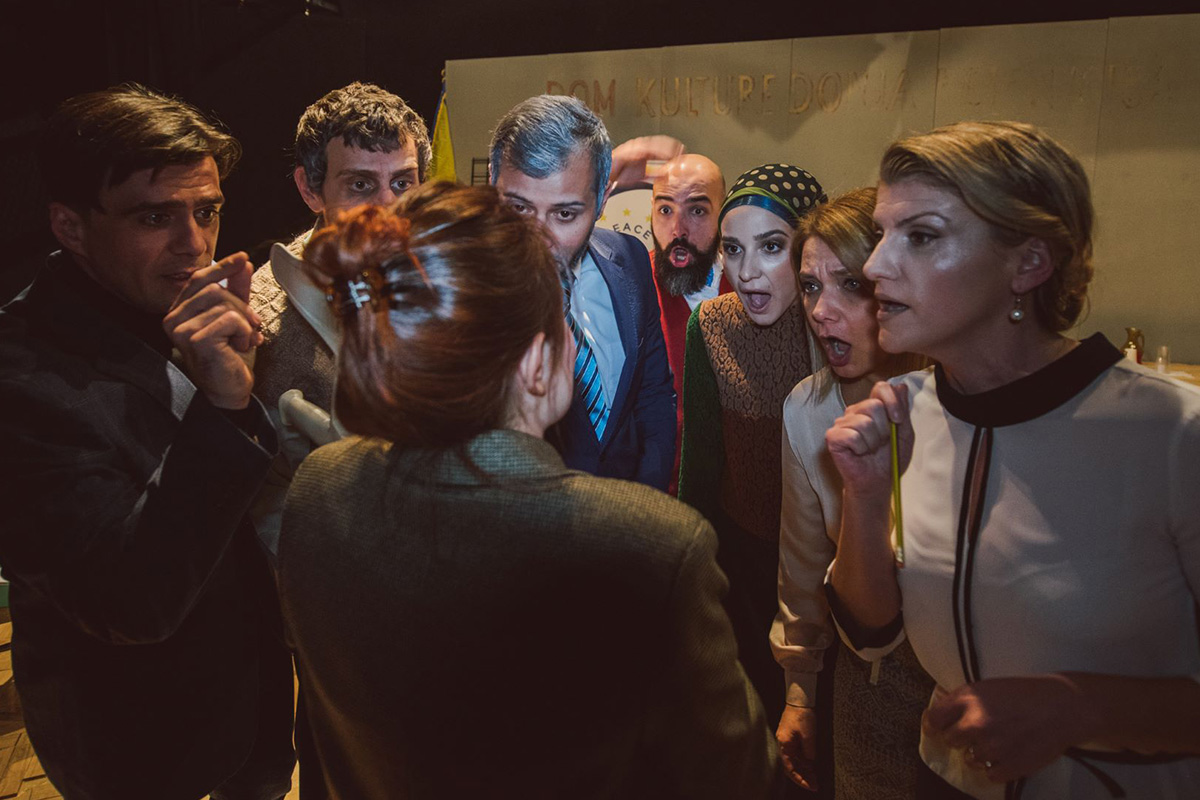 Kompletna struktura predstave nastala je kroz vođene improvizacije glumačkog ansambla. Ta grupa mladih ljudi iz Hrvatskog narodnog kazališta, Narodnog pozorišta i gostiju iz Tuzle, hrabro se uhvatila u koštac sa matricama i stereotipima kolektivnih identiteta koje (srećom!) u velikoj mjeri ne doživljavaju kao svoje – za razliku od nekih starijih generacija – ale koje im ništa manje od ostatka društva kroje kapu i cementiraju neveselu budućnost u današnjoj Bosni i Hercegovini. Igrali smo se, dakle, sa karikaturama i stereotipima nacionalista svih boja, sa dinamikom njihovih sukoba koji u trenu, posve pragmatično prelaze u saveze i sukobe trećeg, sa pokušajima međunarodne zajednice da unese osjećaj za dijalog i toleranciju ne baš uvijek dobro izabranim metodama ... Igrali smo se, ponavljam, i proces rada na ovoj predstavi je bio iskustvo zajedničke igre, istraživanja, s puno smijeha, ali i puno mozganja. Nadam se da ćemo i publiku uključiti u zajedničku radost igre, koja odagnava demone namrgođenih glava vođa s TV-a i njihovih stalnih refrena.