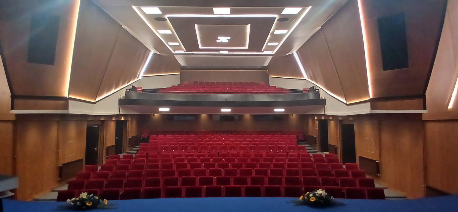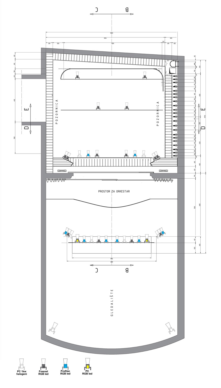 Velika scena je dimenzija 12 x 14 m; opremljena sa 32 PC reflektora snage 1 KW; sa adekvatnim zvučnim parkom.