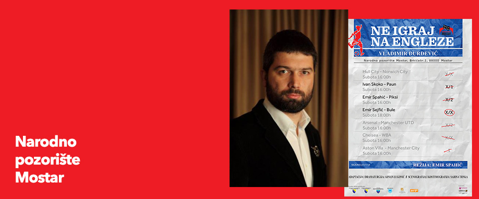 U petak, 1. 12. u 20 sati u Narodnom pozorištu Mostar premijerno će biti izvedena predstava “Ne igraj na Engleze” po tekstu Vladimira Đurđevića, u režiji Emira Spahića. Emir Spahić (koji igra Piksija), Ivan Skoko (Paun) i Emir Sejfić (Bule) u predstavi igraju tri prijatelja, tri kladioničara koji igraju na tri različita uloga – u jednoj noći i jednoj utakmici, otkrivaju se svi njihovi strahovi i sve njihove slabosti. “Ne igraj na Engleze” je komedija – crna komedija – koju će voljeti i kritika i publika, istaknuto je na današnjoj konferenciji za novinare u NPM-u ansambl predstave.