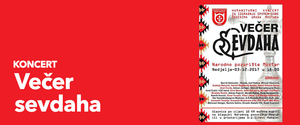 Humanitarni koncert za izgradnju spomen-sobe šehidima Mostara 'Večer sevdaha' bit će održan u Narodnom pozorištu Mostar u nedjelju, 3. decembra u 18 sati.