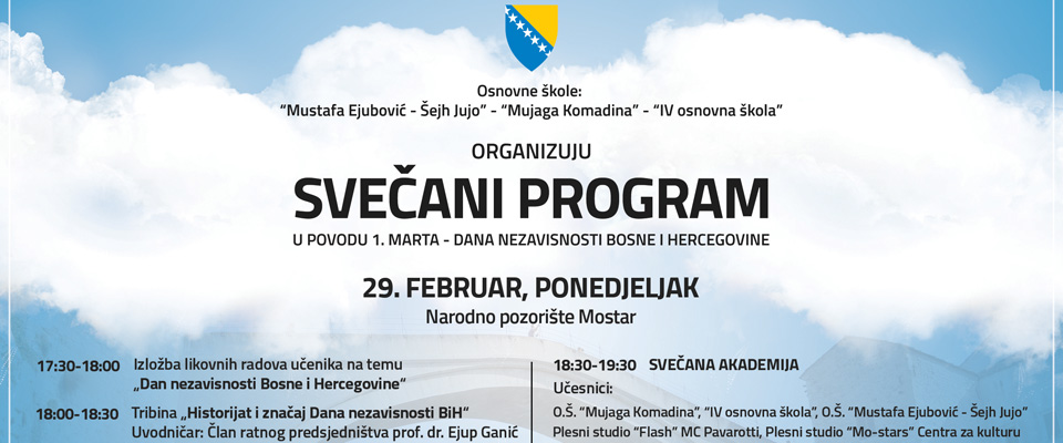 Čast nam je pozvati Vas na program obilježavanja Dana nezavisnosti BIH u organizaciji tri osnovne škole iz Mostara: Osnovna škola "Mujaga Komadina", "IV osnovna škola" i Osnovna škola "Mustafa Ejubović-Šejh Jujo".