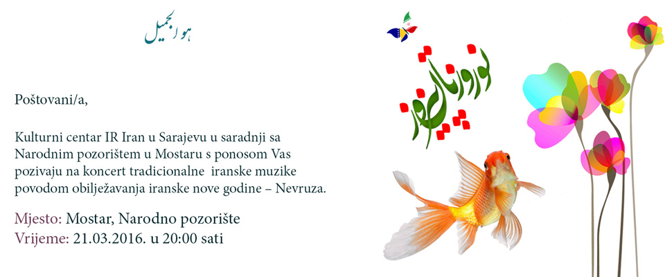 Iranski kulturni centar u Sarajevu s radošću obavještava da u okviru predstavljanja kulturne tradicije Irana prijateljskom narodu Bosne i Hercegovine, i obilježavanja nastupajuće iranske nove godine – Nevruza organizuje program pod naslovom Koncert tradicionalne iranske muzike.